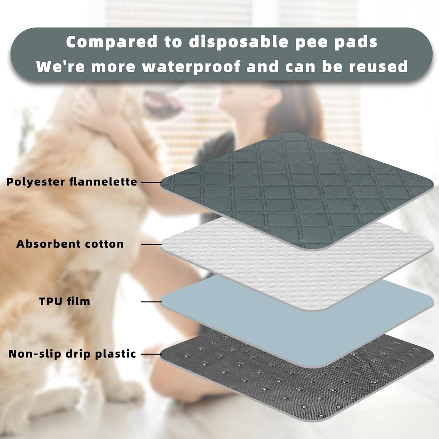 • NON-SLIP BOTTOM: There is plenty of non-slip silicone on the bottom. It helps the washable pee pad stay on the floor or carpet so it won't slide. Please do not place the dog pee pads on heated floors or under strong sunlight, as the non-slip points may melt under high temperature.
