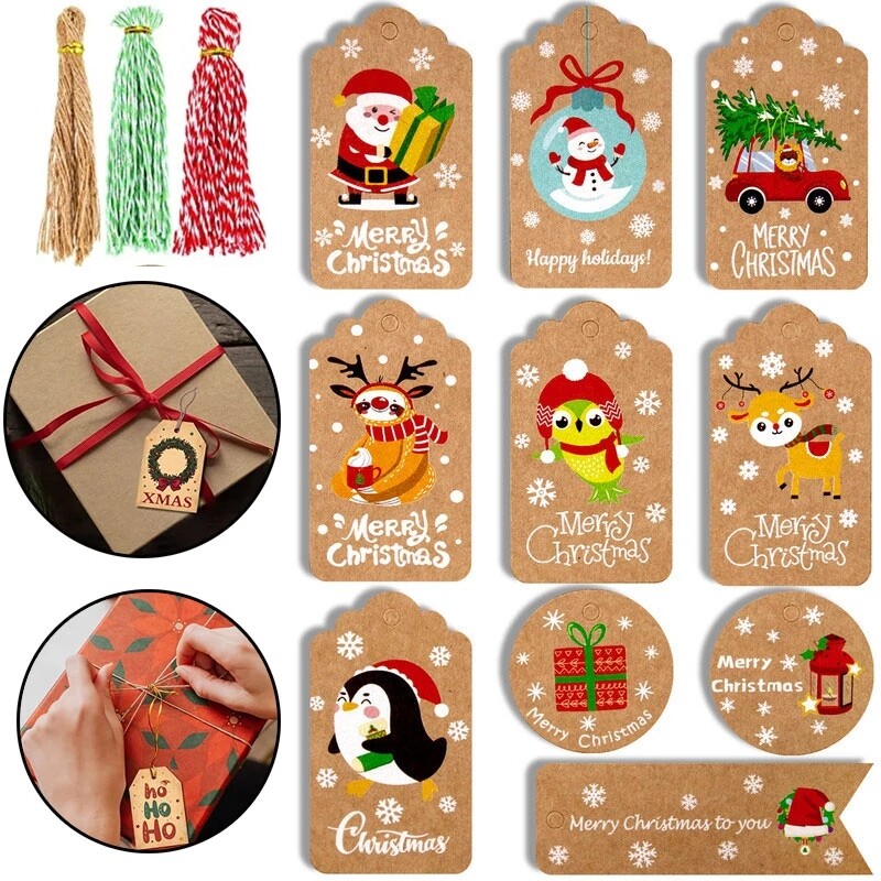 50Pcs Merry Christmas Kraft Paper Tags DIY Handmade Gift Wrapping Paper Labels Santa Claus Hang Tag Ornaments New Year Decor