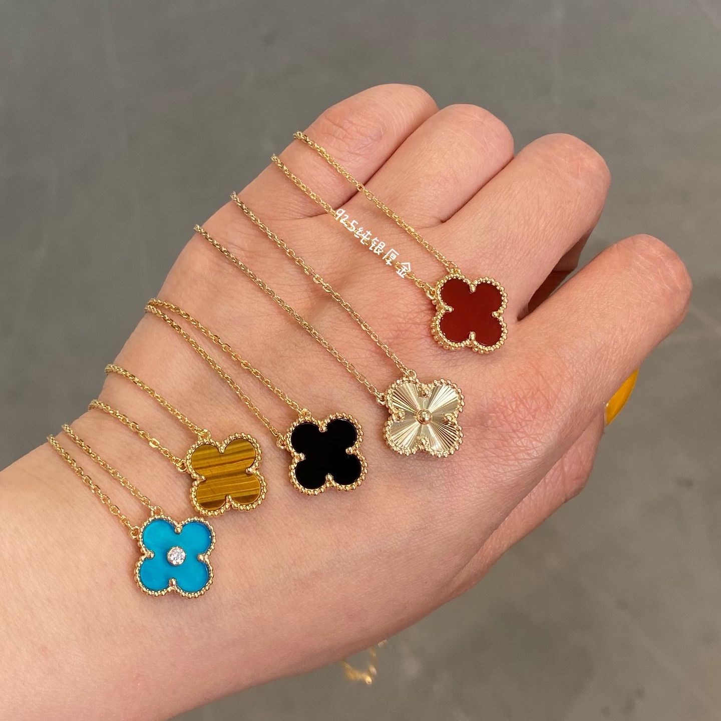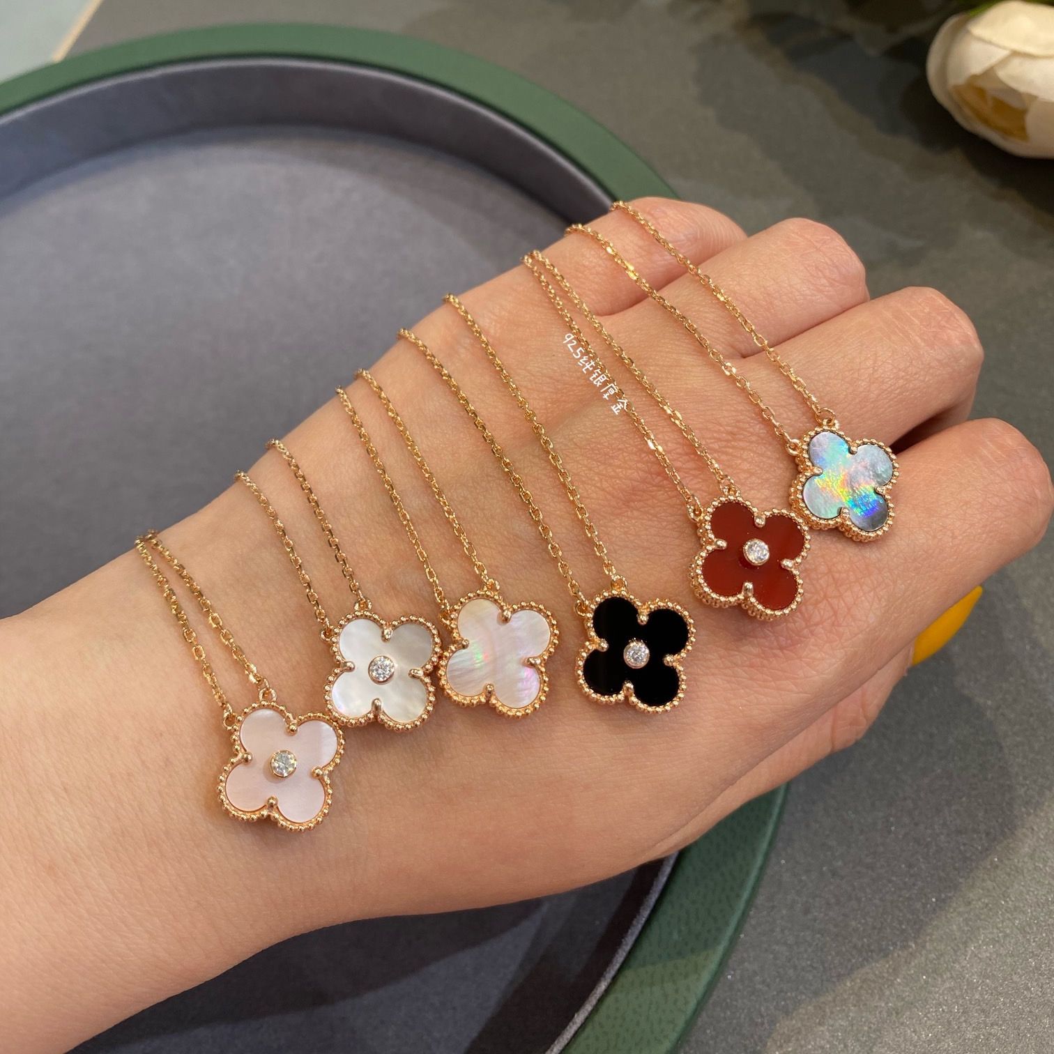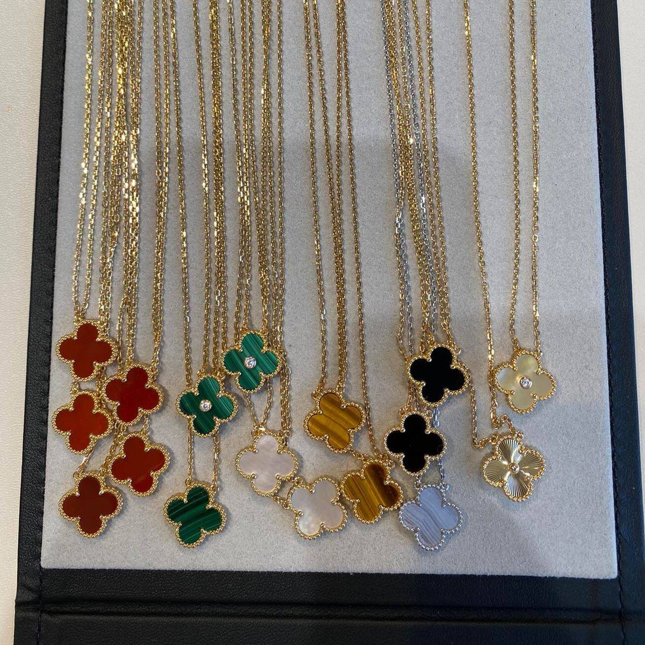 Inlaid with high-quality natural stones, the four-leaf clovers are hand-set
