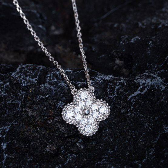 [Hot Sale] Four Leaf Clover Collection Vintage Flower Pendant Necklace With Single Shiny Round Diamond for Women Korean Clavicle Chain Pendant Necklace