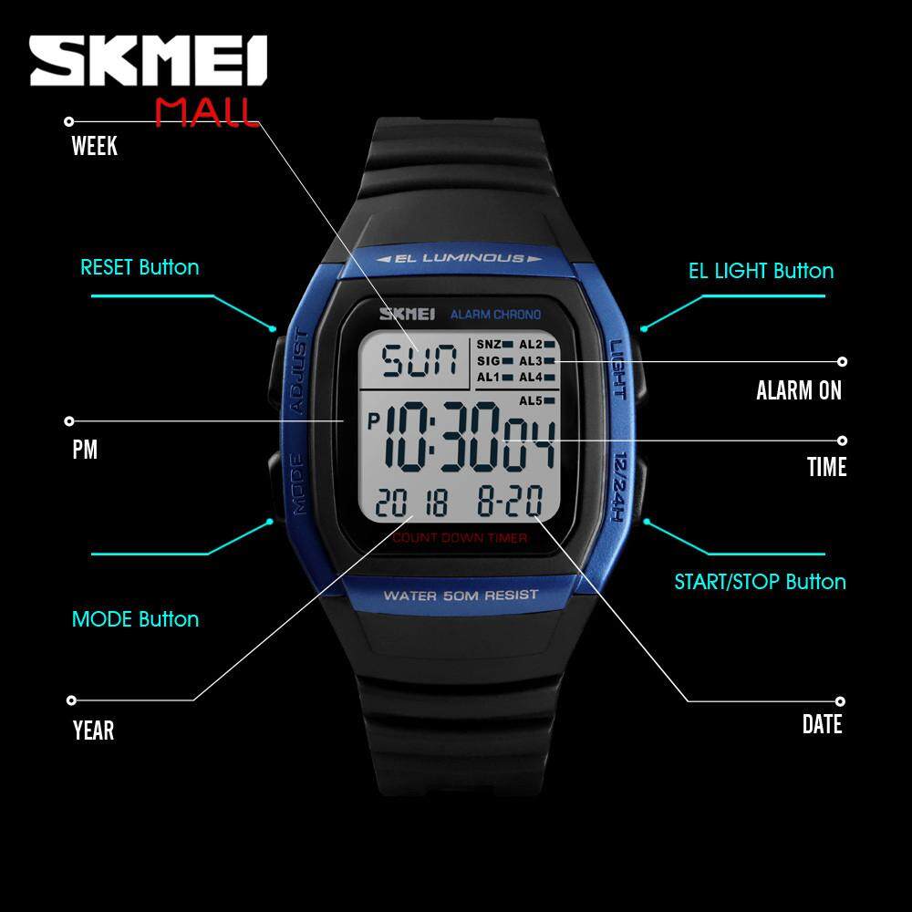 Features: 5 Groups Alarm / 50m Water Resistant / Auto Complete Calendar / 24 Hours Countdown / Split Chronograph / EL Backlight / Shock-Resistant / Double Time / Timed Reminder / 12/24 Hour / Snooze / Hourly Chime
