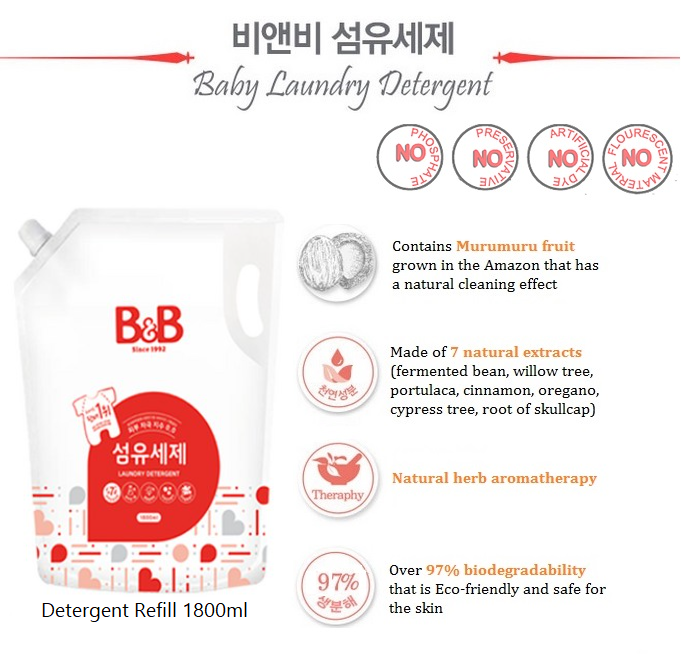 B&B'shypoallergenic and chemical-free baby detergent helps protect your baby'sdelicate skin against skin irritation and rashes with the gentle and effectiveformula. Contains Murumuru fruit grown in Amazon, which cleanses baby fabricnaturally. Our hypoallergenic formulation is topped off with natural herbscent, which comforts the mind and body through aroma therapy.