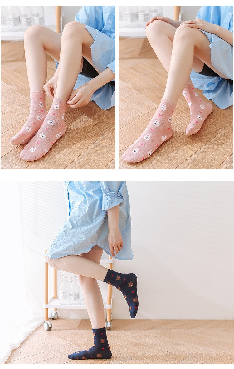 (10 pairs)Woman Cute Embroidered Cartoon Bear Cotton Socks Kawaii Candy Color Breathable Comfortable Boat Socks Female Casual Sock Ladies Ankle Socks